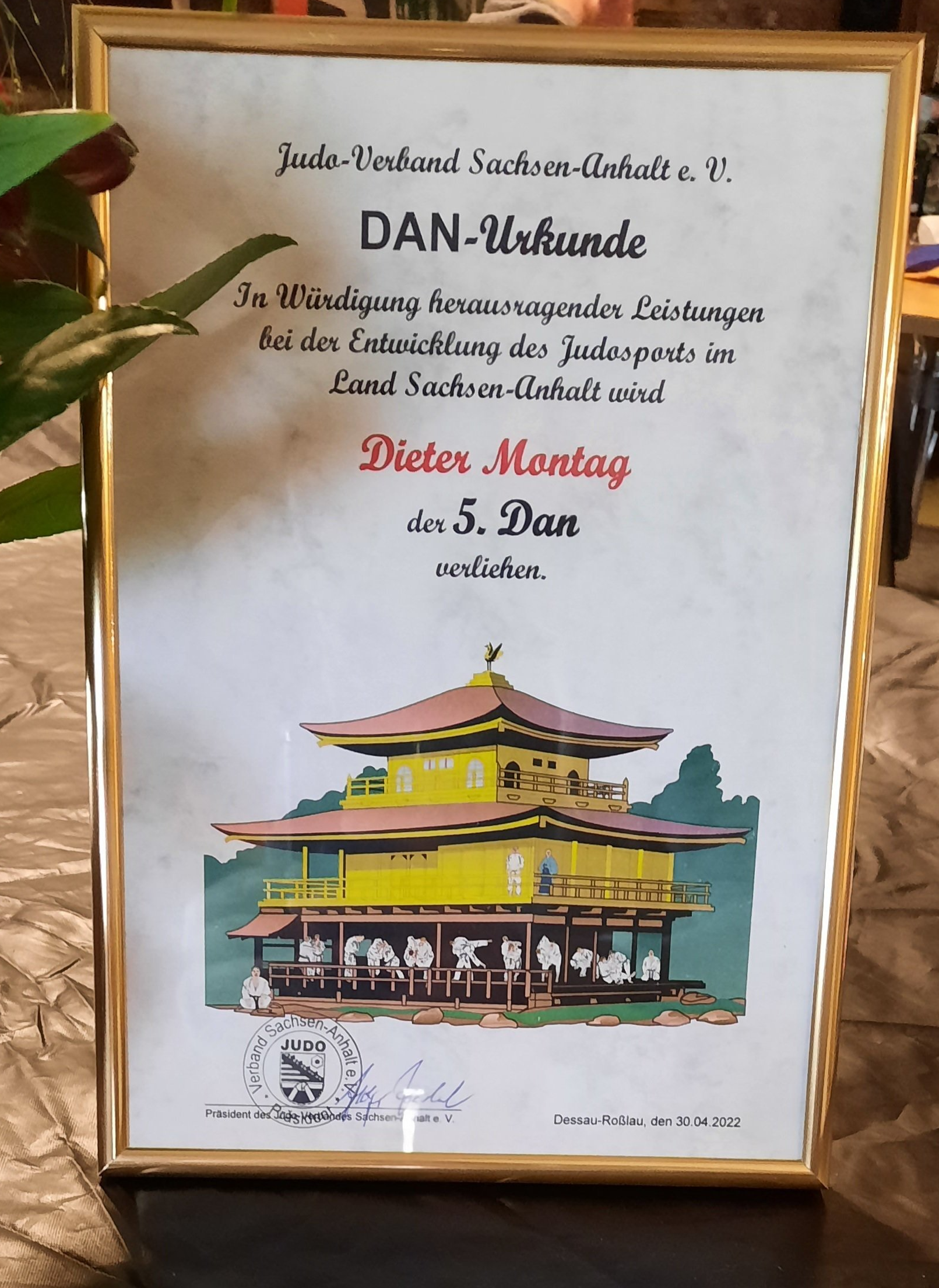 Am 30.04.2022 erhielt Dieter Montag die Verleihungsurkunde zum 5. DAN (Go-DAN). Die Ehrung übernahm Holger Henschel, Mitglied des Präsidiums des Landesverbandes Sachsen-Anhalt.