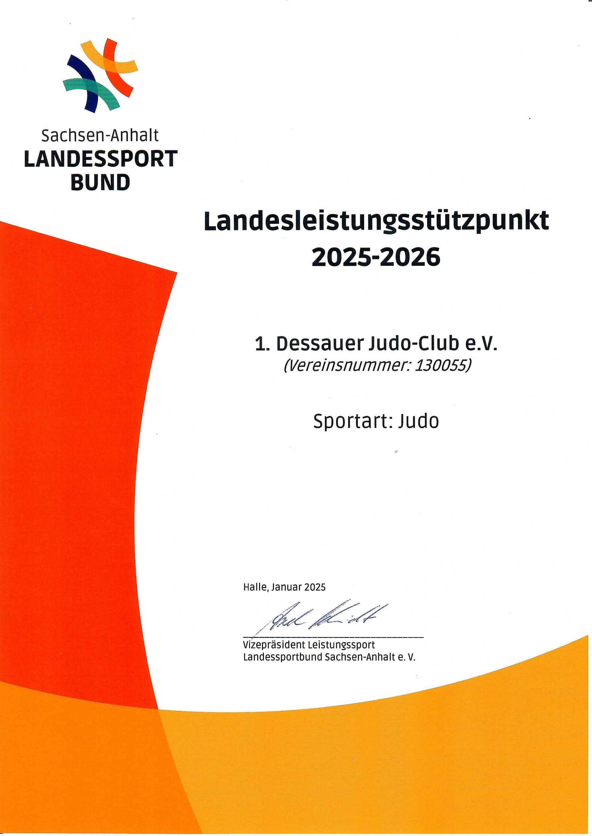 Am 11. März 2025 erhielt unser Verein erneut die Berufung zum Landesleistungsstützpunkt für unsere Sportart. Damit wird die gute Nachwuchsarbeit in unserem Verein hervorgehoben. Überreicht wurden die Ernennungsurkunden durch den Vorsitzenden des Stadtsportbundes Herrn Torsten Ceglarek. In einer kleinen Feierstunde wurde auch über die Vereinsarbeit und deren Herausforderungen gesprochen. Einig waren sich alle Teilnehmer, dass die Nutzung der Sportstätten in unserer Doppelstadt verbessert und ausgebaut werden müssen. Neben den Judokas, erhielten weitere Vereine ihre Ernennungsurkunden. Darunter Erazo Taekwondo, der 1. LAC, Floorball und Schwimmer vom PSV90, die Dessau Volleys und Speedskater sowie die Fußballer von Germania Roßlau und dem SV Dessau 05.