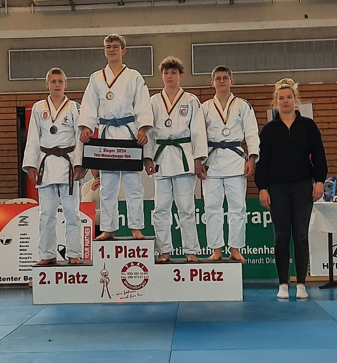 Jakob und Marius konnten sich nach ihren Kämpfen über einen tollen 2. Platz und die Silbermedaille freuen. Ganz vorn landete Richard, der alle seine Kämpfe vorzeitig gewinnen konnte und so die Goldmedaille mit nach Hause nahm. Die tollen Ergebnisse von Liv und den 3 Jungs reichten, um auch den 3. Platz in der Gesamtwertung in dieser Altersklasse zu erzielen.