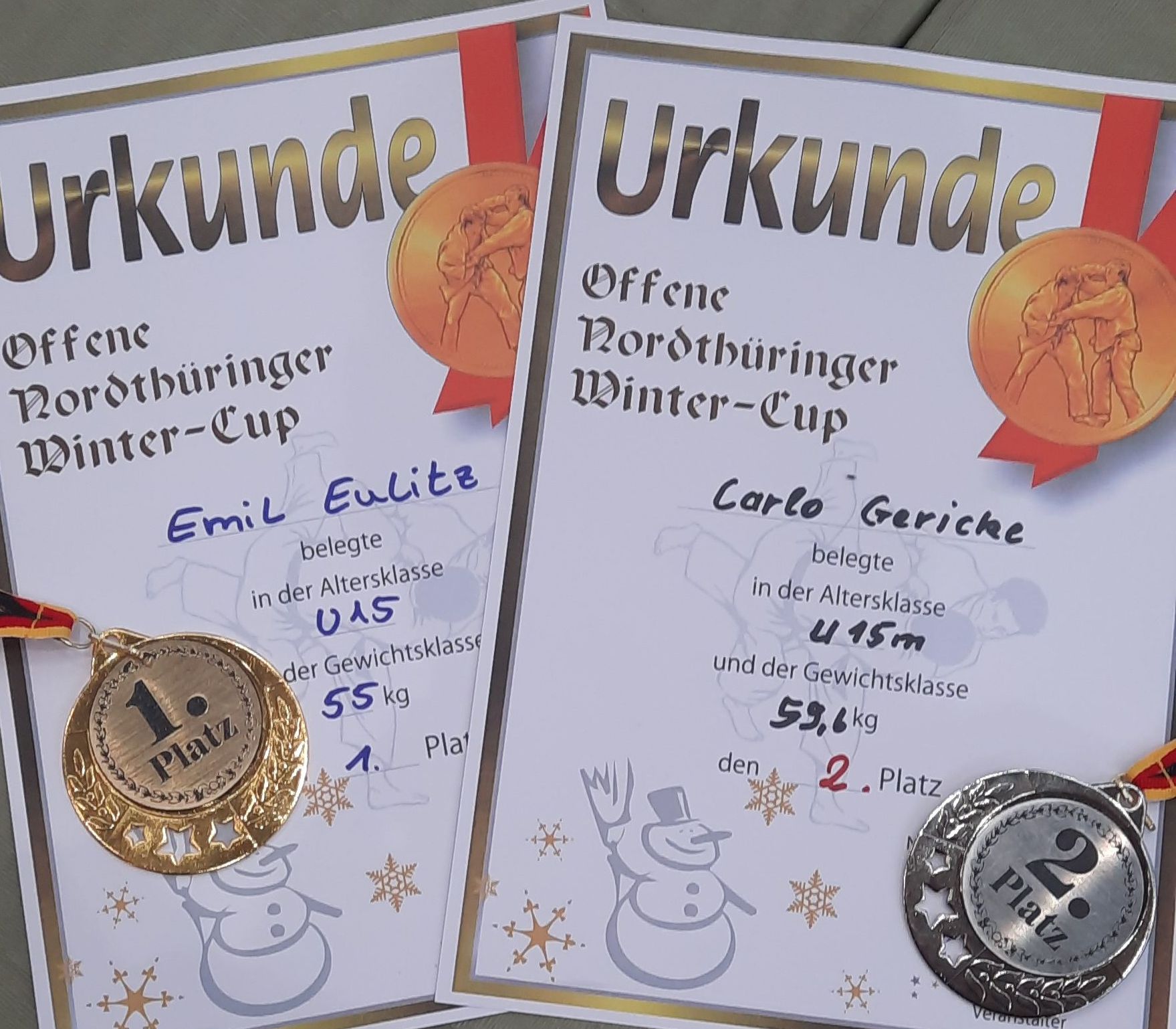 Carlo hatte gleich in seinem ersten Kampf einen starken Gegner, so dass die Entscheidung erst im Golden Score fiel. Hier konnte Carlo dann eine Aktion starten und den Kampf gewinnen. Dieser Kampf hat viel Kraft gekostet, so dass der zweite Kampf leider verloren ging. Trotzdem war dies ein toller 2. Platz. Emil hatte 3 Kämpfe, einschließlich eines Freundschaftskampfes, die er alle für sich entscheiden konnte.